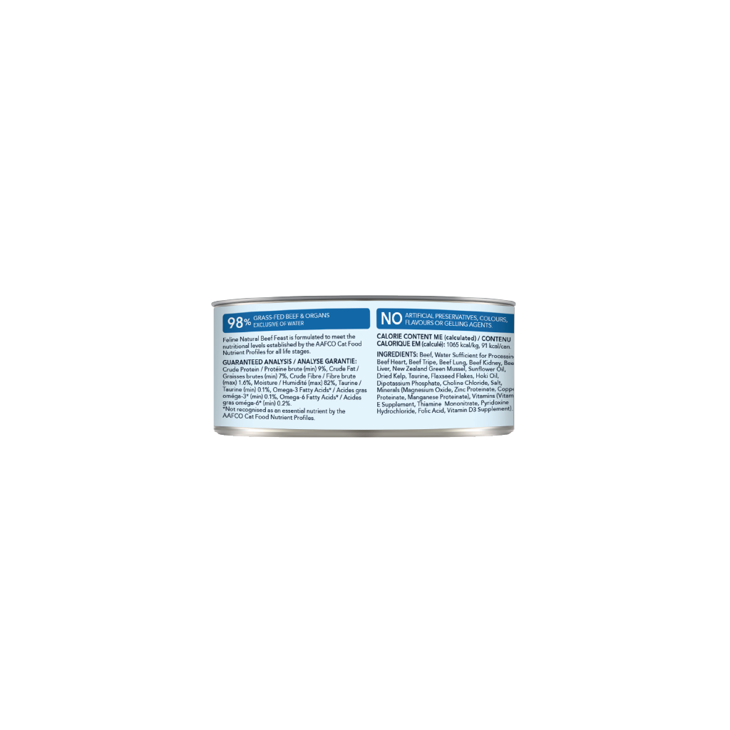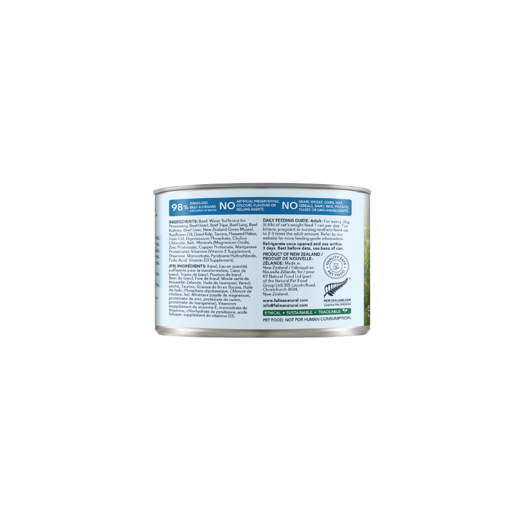 Beef, Water Sufficient for Processing, Beef Heart, Beef Tripe, Beef Lung, Beef Kidney, Beef Liver, New Zealand Green Mussel, Sunflower Oil, Dried Kelp, Taurine, Flaxseed Flakes, Hoki Oil, Dipotassium Phosphate, Choline Chloride, Salt, Minerals (Magnesium Oxide, Zinc Proteinate, Copper Proteinate, Manganese Proteinate), Vitamins (Vitamin E Supplement, Thiamine Mononitrate, Pyridoxine Hydrochloride, Folic Acid, Vitamin D3 Supplement).