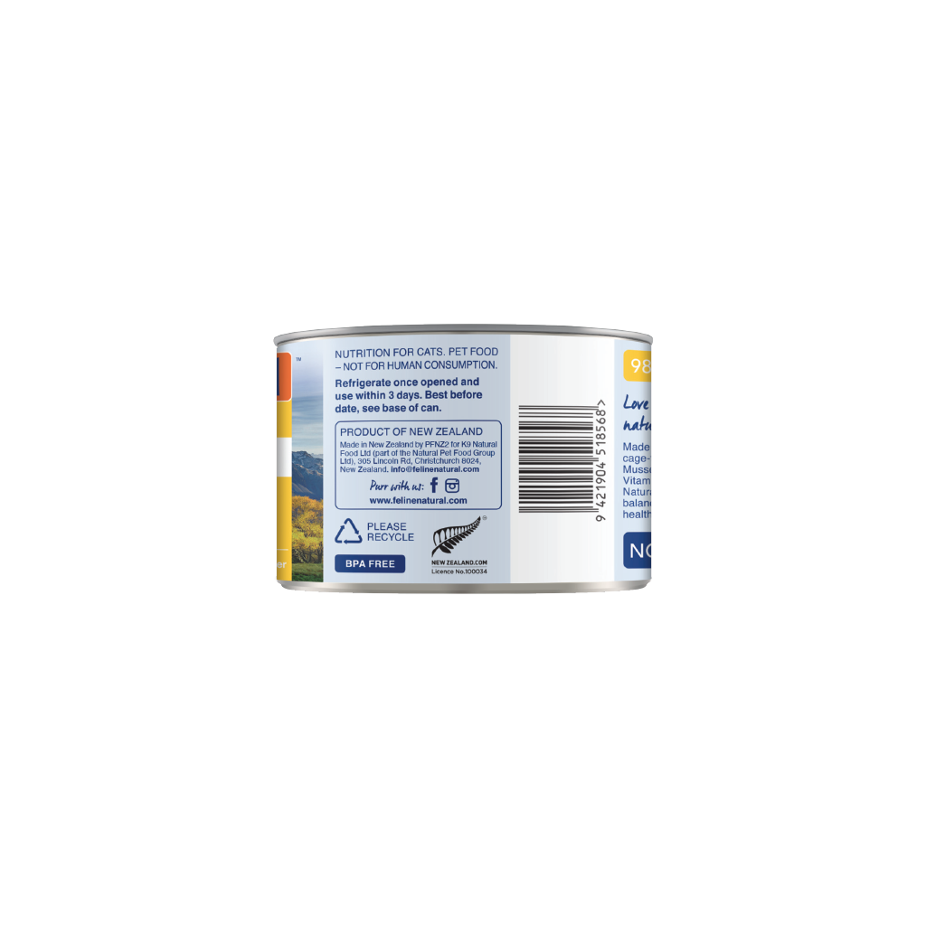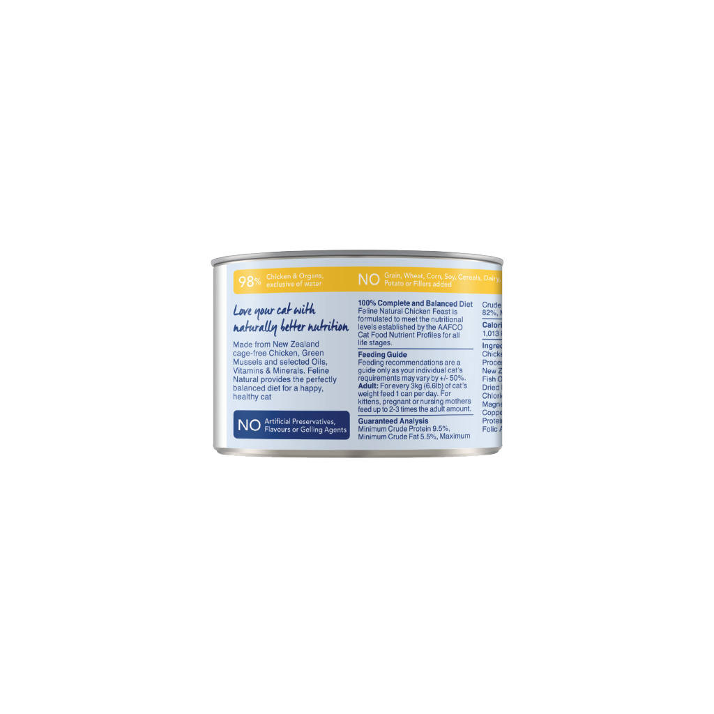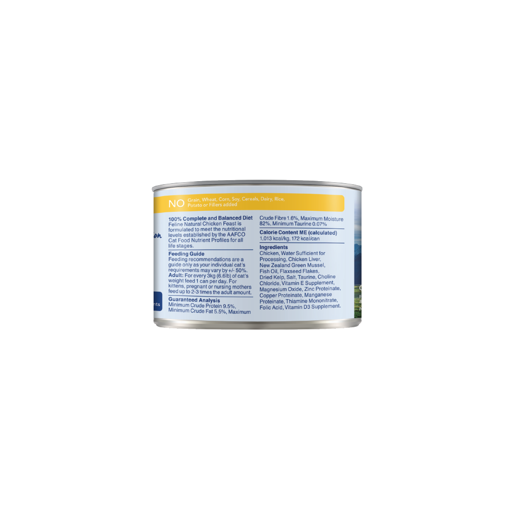 Chicken, Water Sufficient for Processing, Chicken Liver, New Zealand Green Mussel, Fish Oil, Flaxseed Flakes, Dried Kelp, Salt, Taurine, Choline Chloride, Vitamin E Supplement, Magnesium Oxide, Zinc Proteinate, Copper Proteinate, Manganese Proteinate, Thiamine Mononitrate, Folic Acid, Vitamin D3 Supplement.