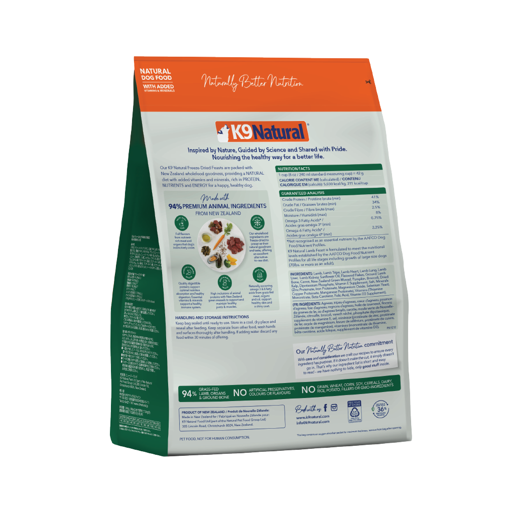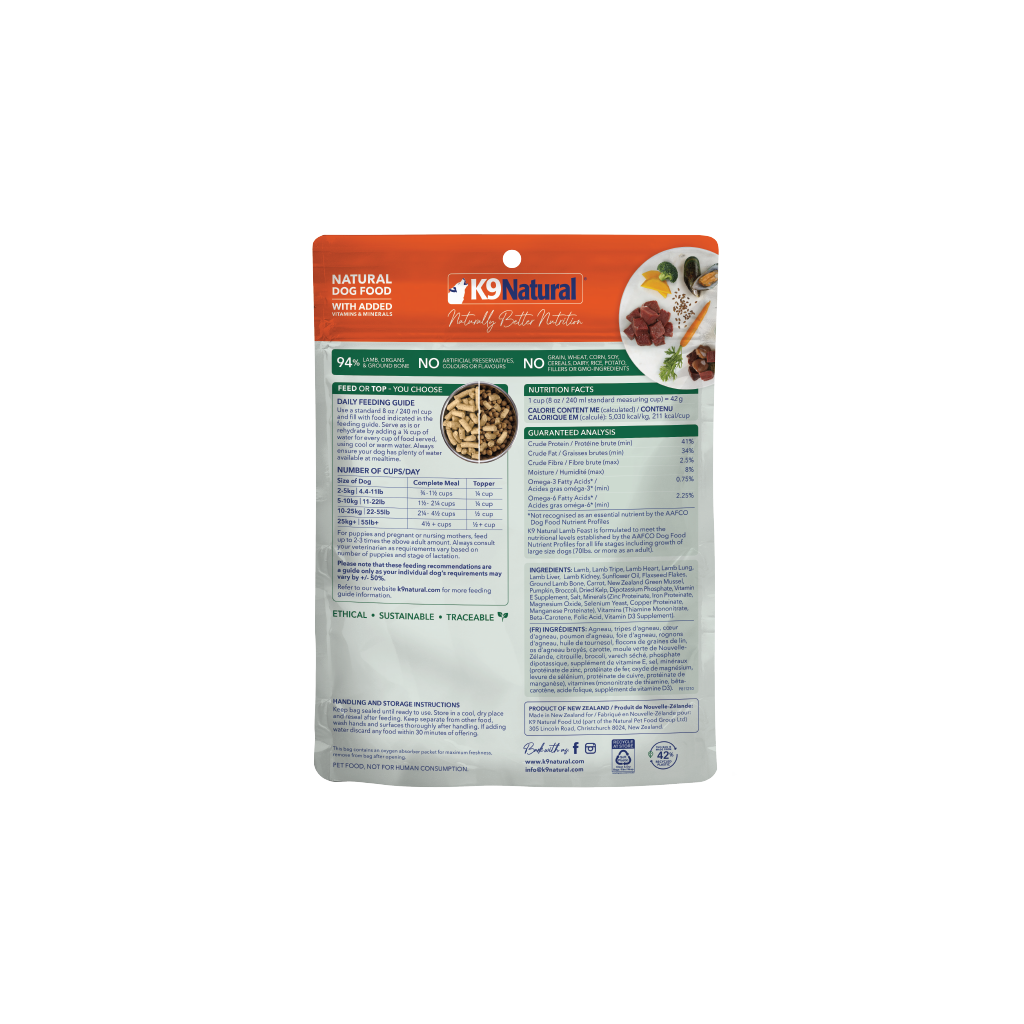 Lamb, Lamb Tripe, Lamb Heart, Lamb Lung, Lamb Liver, Lamb Kidney, Sunflower Oil, Flaxseed Flakes, Ground Lamb Bone, Carrot, New Zealand Green Mussel, Pumpkin, Broccoli, Dried Kelp, Dipotassium Phosphate, Vitamin E Supplement, Salt, Minerals (Zinc Proteinate, Iron Proteinate, Magnesium Oxide, Selenium Yeast, Copper Proteinate, Manganese Proteinate), Vitamins (Thiamine Mononitrate, Beta-Carotene, Folic Acid, Vitamin D3 Supplement).