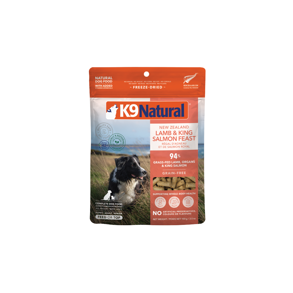 Our complete and balanced Freeze-Dried New Zealand Lamb & King Salmon Feast contains 94% Grass-fed & Grass-finished Lamb & Organs, and Sustainably-caught King Salmon, with New Zealand Green Mussels, Flaxseed Flakes, Vegetables, Oils, Kelp, Vitamins, and Minerals in support of your dog's whole-body health.